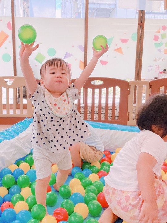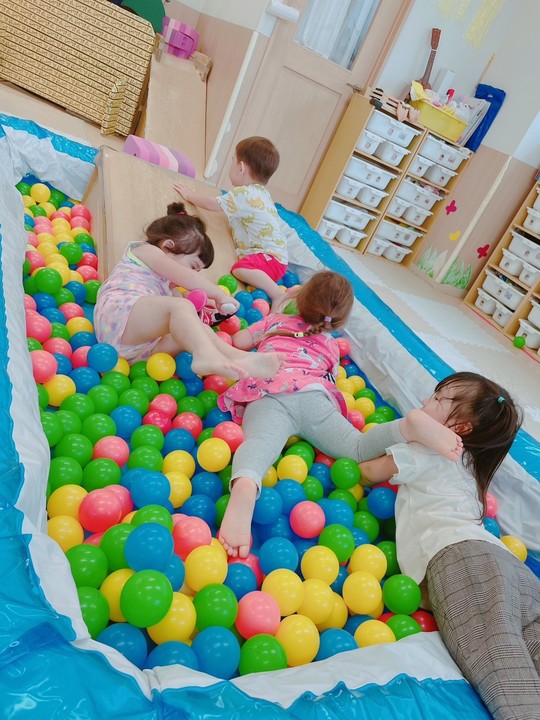 この日は天気が不安定で、お部屋遊びにしました。 子ども達に何をしたいか聞いてみると、「プール!」ということで、お部屋でもプールを出しました(*^_^*) 途中からはボールの中に滑り台も入れてみると、子ども達はダイナミックに体を動かしていました。