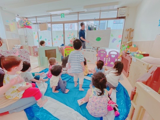 魔法の絨毯に乗って部屋中を移動し、疲れた子は玩具箱に座って絵本を見て、パネルシアターにも興味津々の子ども達でした(^^♪
