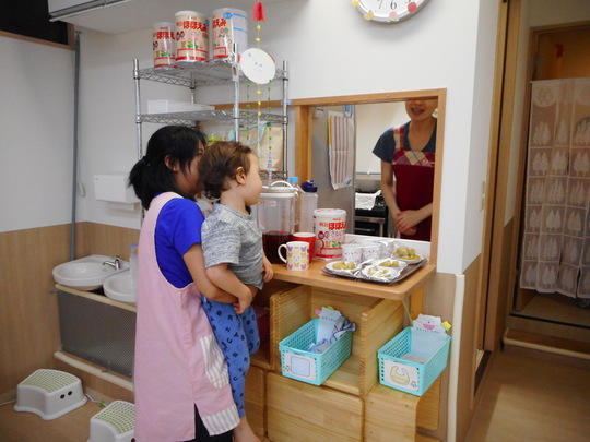 お歌を唄って、元気に挨拶、、、それから朝のおやつをいただきます。