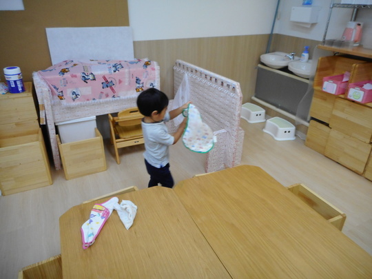 大きい子がお支度する姿を見て、自分でやってみたいと思う子もいます。
