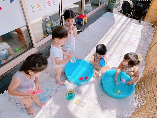 小さい子達は、タライのお水でピシャピシャしたり、お水をすくってジャーっと流して、中には頭からかぶってもけらけらと笑って楽しんでいる子もいます。