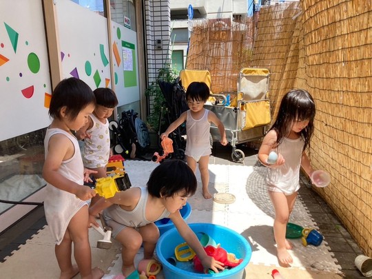 今日は午前中から夏を感じる日差しだったので、テラスで水遊びをしました。 砂場の玩具を皆できれいにしよう、と始めましたが、それだけでおさまるわけがなく、皆びしょびしょになって遊んでいました(*^_^*)